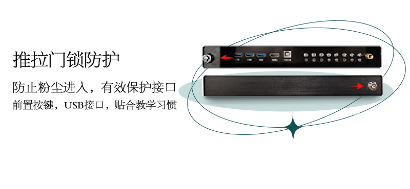 機身保護——獨特的推拉門鎖設計,保護前置按鍵及接口,還能收納白板筆和教鞭;