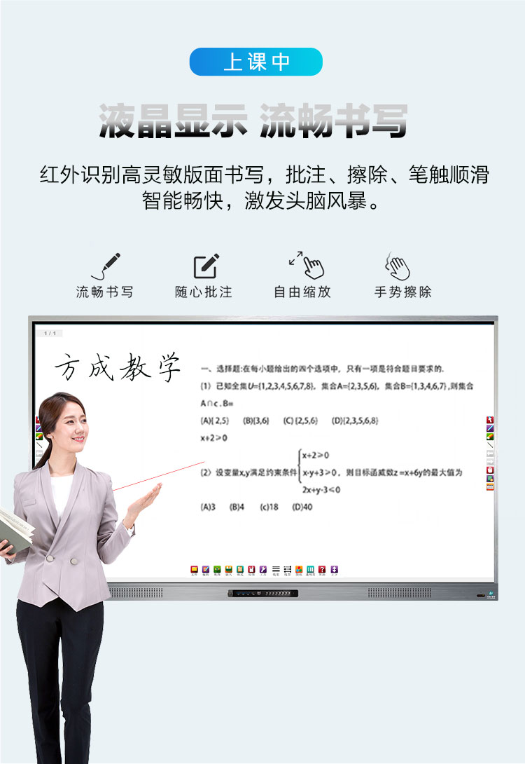 超窄邊多媒體教學(xué)一體機(帶移動支架)-超窄邊框三等邊超窄邊框設(shè)計,推拉門鎖保護(hù),4K超高清顯示,以人機交互的方式,搭載互動白板和無線投屏軟件,實現(xiàn)多人書寫、互聯(lián)互通的互動教學(xué)模式,豐富課堂內(nèi)容,提高學(xué)習(xí)氛圍。